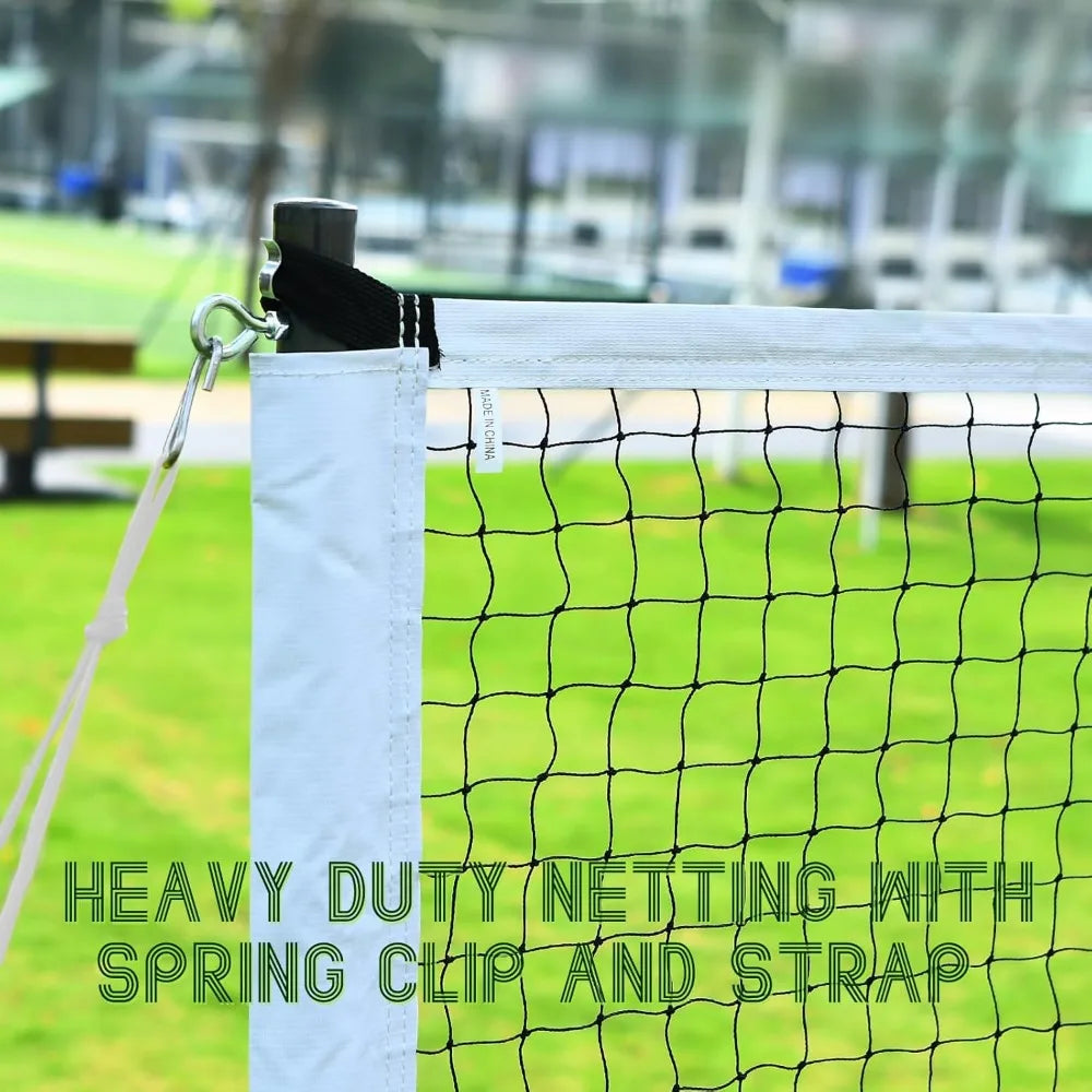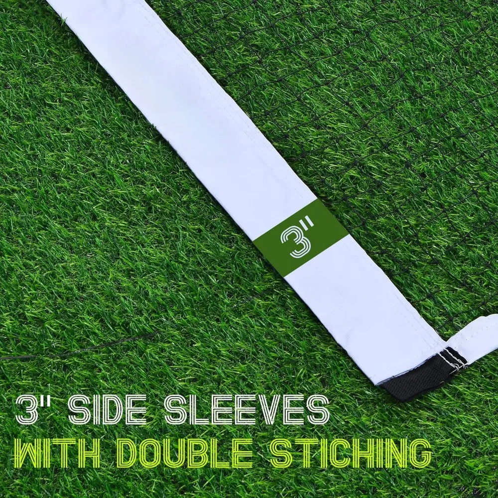 - Regulation-size Net: The 20*2.5FT PE net has 3 inch side sleeves and 1.25 inch top & bottom White waterproof net tape for high visibility and greater strength with no sagging due to this extra re-enforcing. Compared to Oxford cloth fabrics, our PVC sleeves are more resistant to sunlight and UV rays and have longer durability. The double stitching is designed for better tear prevention and lasting.