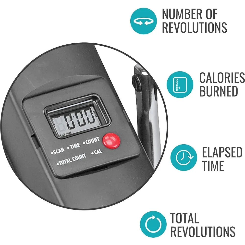 - EASY TO READ DIGITAL DISPLAY MONITOR displays the number of revolutions a workout, estimated calories burned and elapsed time